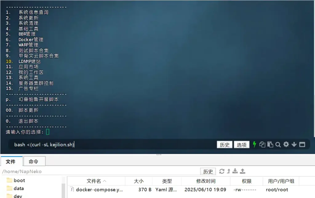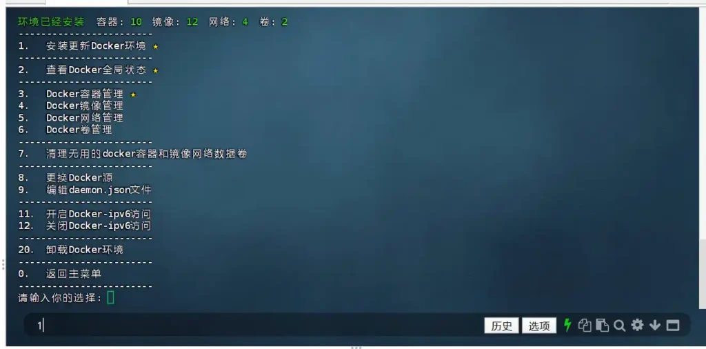 安装完成后,输入字母”k”并按回车键,系统将显示功能选择菜单。在菜单中可以看到第6个选项是与Docker相关的功能。选择该选项后,输入数字1即可自动完成Docker环境的安装。安装完成后,可以通过输入”docker ps”命令来验证Docker是否成功安装。具体可看下图,因为我已经安装了就不执行了。